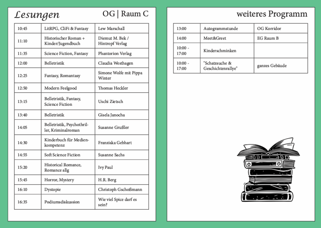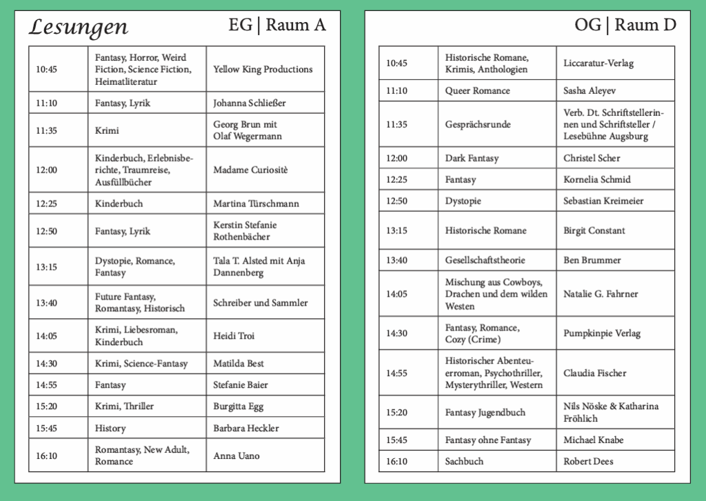 Ab 10:30 finden im Halbstundentakt Lesungen in den Räumen A und B im Obergeschoss, sowie dem Raum C im Erdgeschoss statt.